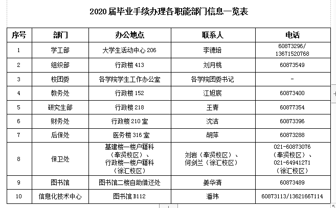 (1)毕业生需拿到毕业证书(结业或肄业的同学须有相关证明材料),到安全保卫处户籍科开具户口迁出介绍信,持毕业证书、身份证、户口迁出介绍信到徐汇区田林社区服务中心(宜山路655弄3号)办理户口迁移证(有效期一个月)。
