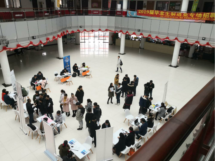 1月4日下午1点,我校2019届毕业生制造业专场招聘会在奉贤校区学生活动中心举行,其中企业宣讲在二楼多功能厅,现场投简历面试在底楼大厅进行。