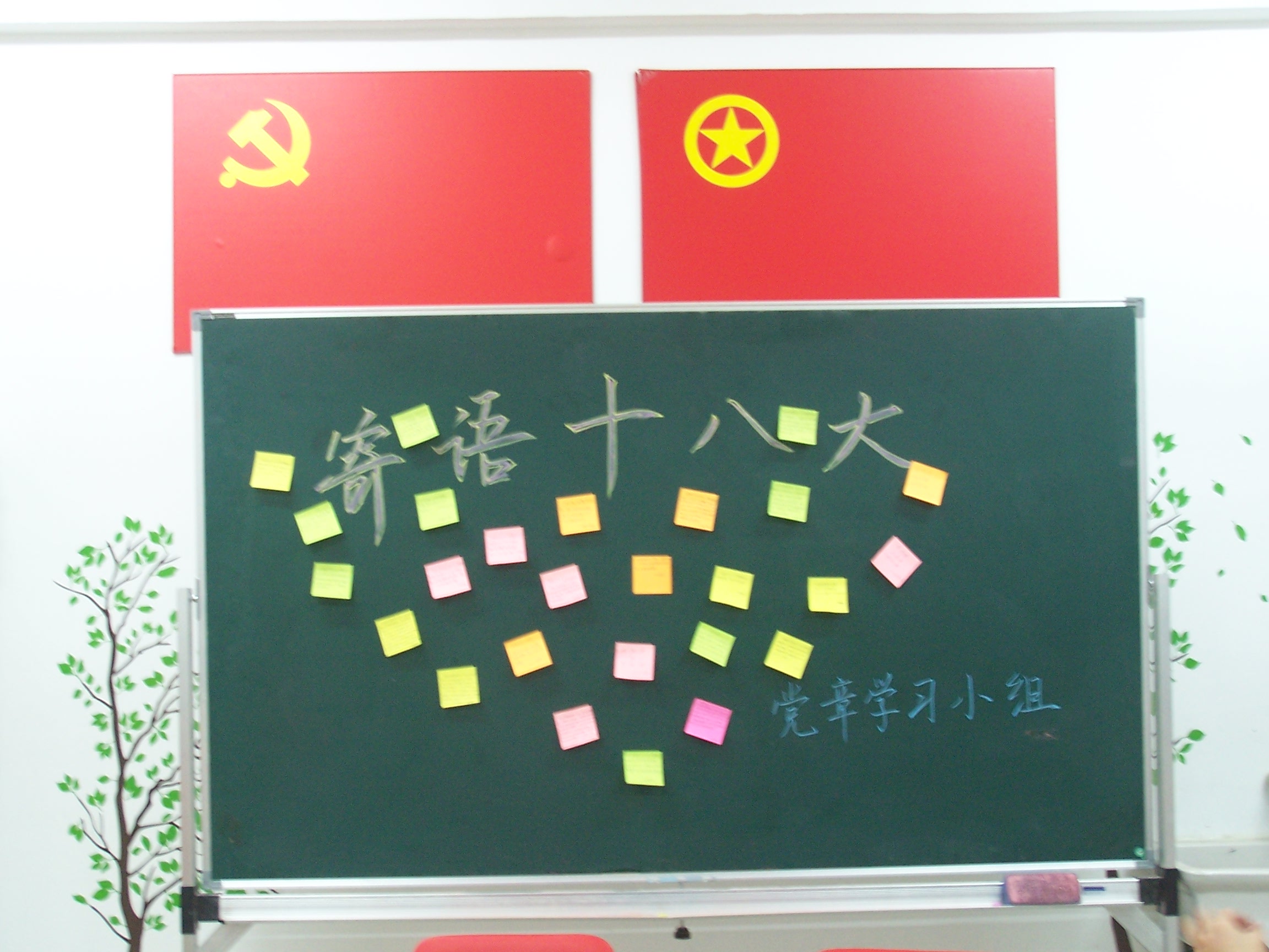 党章学习小组的成员也在组长的带动下,积极响应并发动身边同学在上海基层党建网写下自己的心声和祝福,还在党团活动室留言板贴下了自己对十八的祝愿和对学校更名的向往。党章学习小组第一组组长学生党员杨小舟寄语:“中国共产党的历届全国代表大会串连成了新中国曲折的历史,相信十八大的召开会将中国带向更发达和谐的辉煌未来!预祝十八大顺利召开,祝福祖国更加繁荣富强!作为一名学生党员,我们会在大学努力学习专业知识,在各方面起好模范带头作用,为将来成长为国家发展的中坚力量而奠定扎实的基础。”党章学习第三小组徐达写道:“九十一度春去秋来,九十一载风雨兼程。用镰刀收获希望,用铁锤锻造脊梁。中国共产党唤醒沉睡的雄狮、倾起民族的梦想,中国共产党开辟解放的道路、引领国家的富强。回顾历史我们新潮澎湃,展望未来我们热血沸腾。十八大将至,祝:十八大顺利召开,中国共产党领导我们共同富强,中国越来越强。”