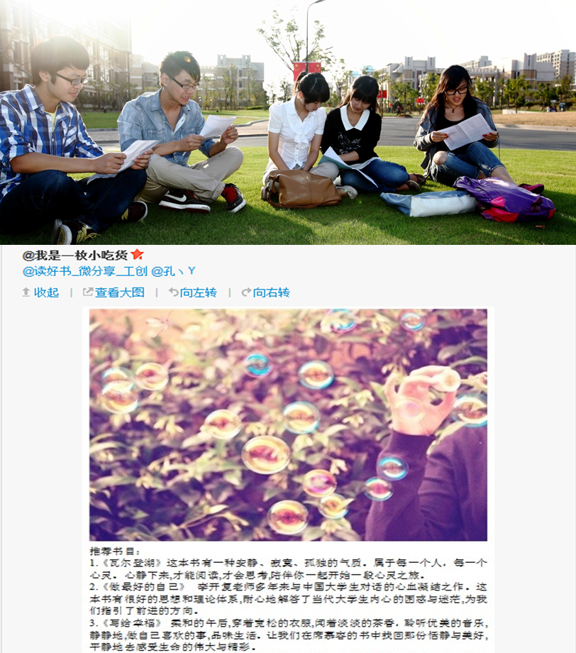 工程创新学院喜迎党的“十八大”系列活动之一的“读好书,微分享”专题活动于10月23日至11月30日举行。此项活动旨在通过“读好书_微分享_工创”的主页平台,一方面发布推荐书单,包括名人传记、历史文学、名家散文和多部经典文学名著,一方面将粉丝@微博中的文学感悟、文艺小品和众多评论转发至主页,激发同学们以微博的形式书写知识与道德,将所思所想汇聚成学院的优质学风,为迎接“十八大”的胜利召开和学校更名做出积极的努力。