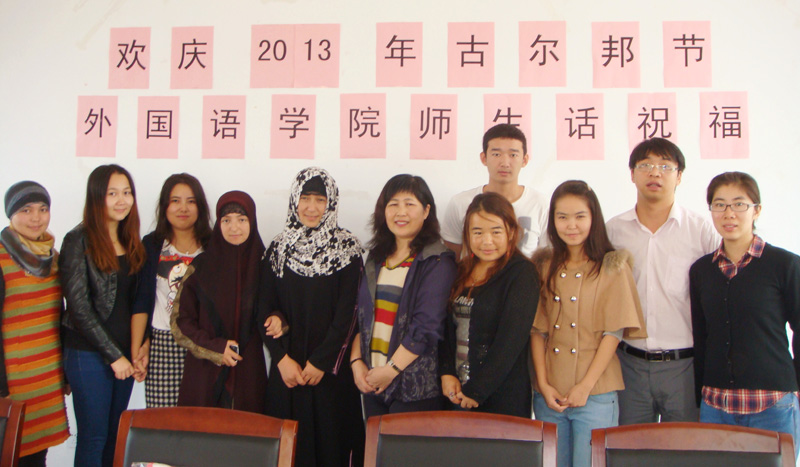 今年的10月26日是一年一度的古尔邦节,古尔邦节相当于汉族的春节。10月26日中午在文科楼B213,外国语学院领导老师与新疆籍11名少数民族学生一起欢度古尔邦节,外国语学院书记张淑梅、院长陈家旭、辅导员老师以及11名少数民族生参与了欢庆会。