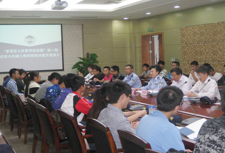 10月12日下午,奉贤区公民警校进校园第一期应技大机械工程学院培训班开学典礼在我校图书馆B103隆重举行。奉贤公安分局政治处副主任高梅香和学生处副处长翁德明出席典礼并讲话。