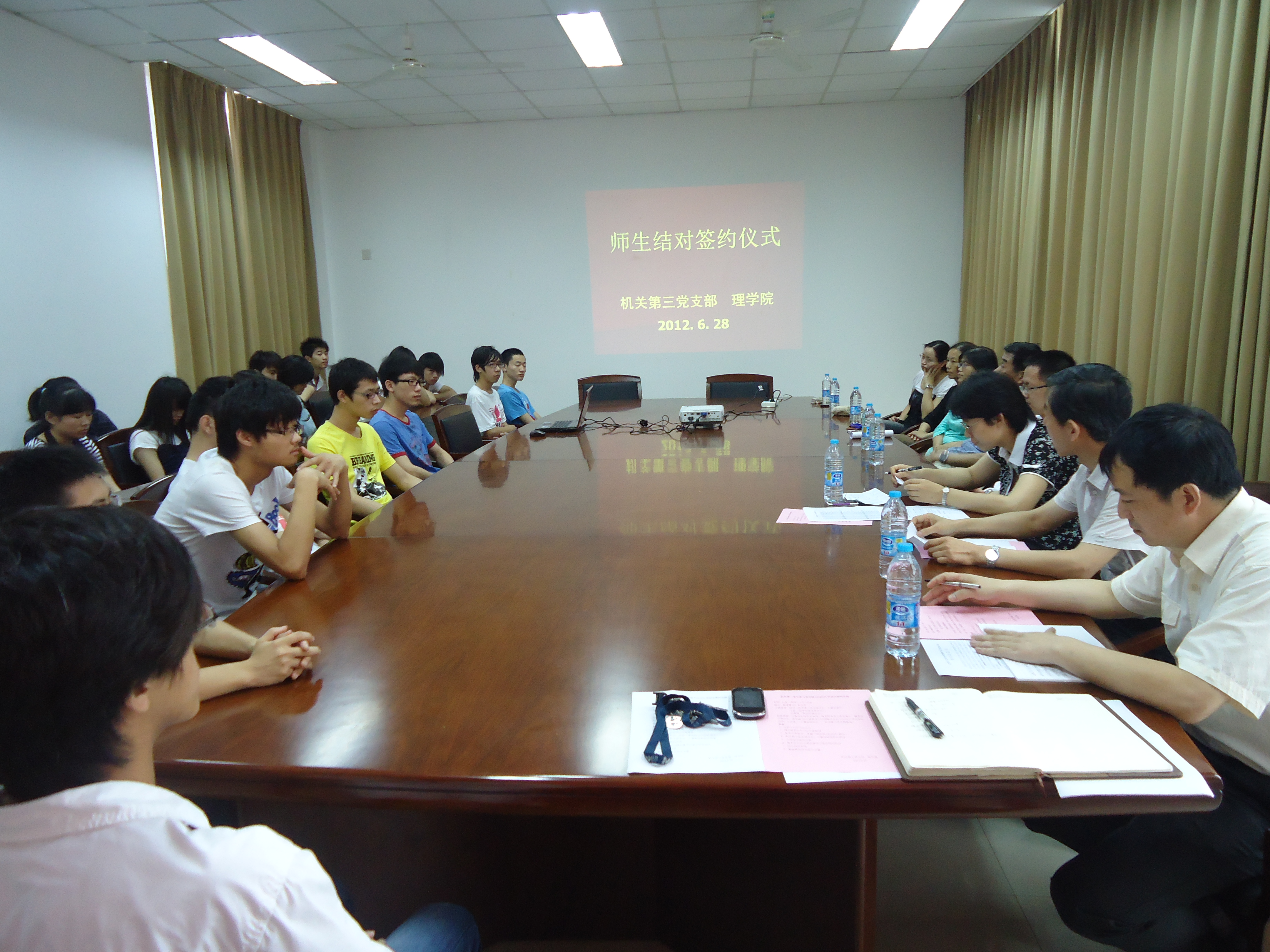仪式上,首先由理学院党总支书记致辞,向机关第三党支部对理学院学生的关心和支持表示了感谢,向结对学生提出了珍惜机会、好好发展的希望和要求。接着,机关第三党支部书记孙劼介绍了师生结对的意义和精神,希望学生储备知识和能力,不断提高综合素质,充分发扬理学特色。人事处副处长于有进,就双方结对的具体内容进行了讲解。在第三党支部书记孙劼和1112211班级团支书签订结对协议后,结对师生之间还进行了沟通与交流,并合影留念。
