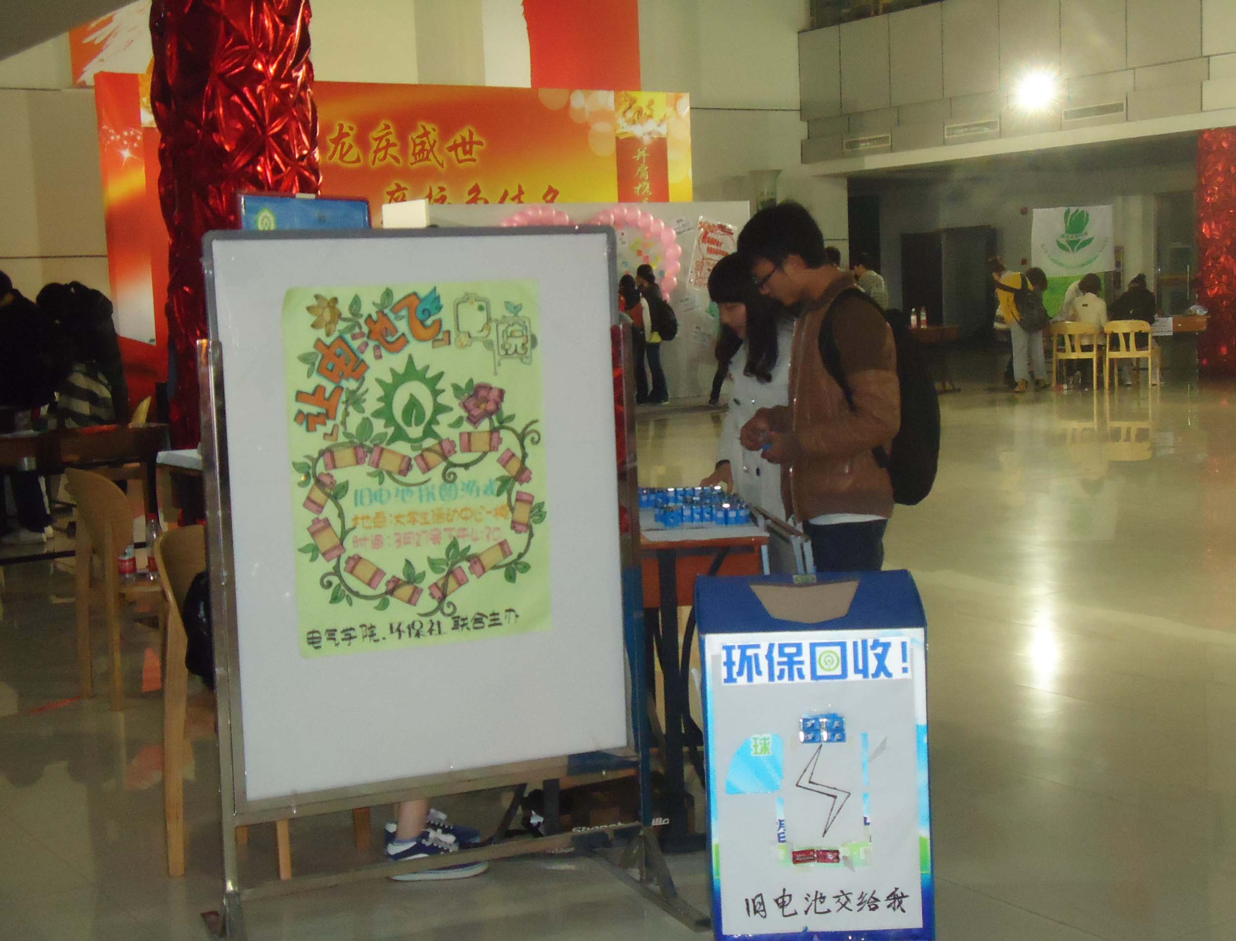 废旧电池创意活动 3月27日下午,以环保为主题的普及活动在大学生活动中心一楼大厅举行。这次活动是由不同的环保主题构成,同学们通过参与各项活动来获得游戏奖励。我们所组织的模块是让同学们利用我们收集来的废旧电池,通过发挥想象力,拼出属于自己的创意图案。这次活动得到同学们的积极参与。活动中,同学们充满了想象力,除了拼出各种动物、建筑模型,更是有同学利用灯光的投射作用拼出了心目中的“LOVE”等各种字符。