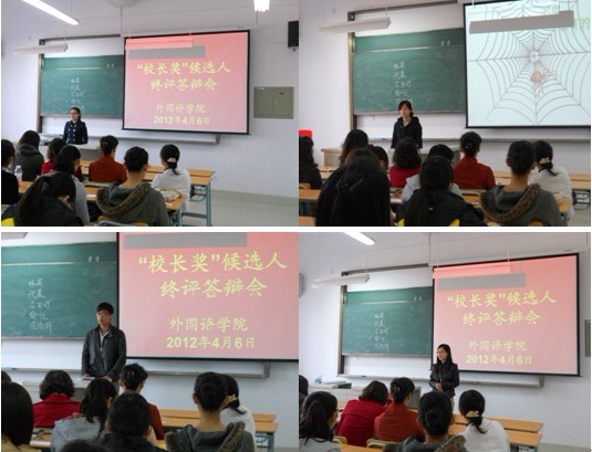在“校长奖”评选前期,外国语学院本着公平、公正、公开的原则,通过飞信通知、邮箱发布、微博公布等形式,让全院学生及时了解校长奖评选活动的精神和动态。经过个人申报、班级投票、评委会审核讨论产生了5名候选人,最后5名候选人参加答辩会。每名候选人进行3分钟的自我陈述,并接受评委老师的提问。答辩结束后,进行了现场公开投票,最终确定了范春群同学为外国语学院校长奖候选人。
