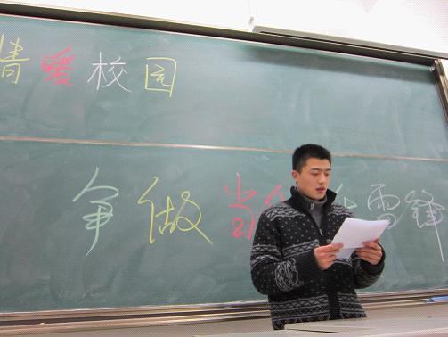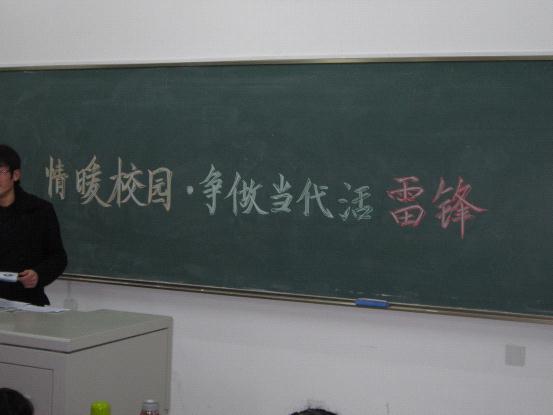 教室不小,却是人头攒动,生态学子在教室里认真观看雷锋纪录片,纷纷上台发表自己对学习雷锋精神的看法,并积极踊跃地在倡议书上签下自己的名字。最后同学们还精心书写了“情暖校园,争做当代活雷锋”几个大字,让雷锋精神在生态学院抽芽开花。