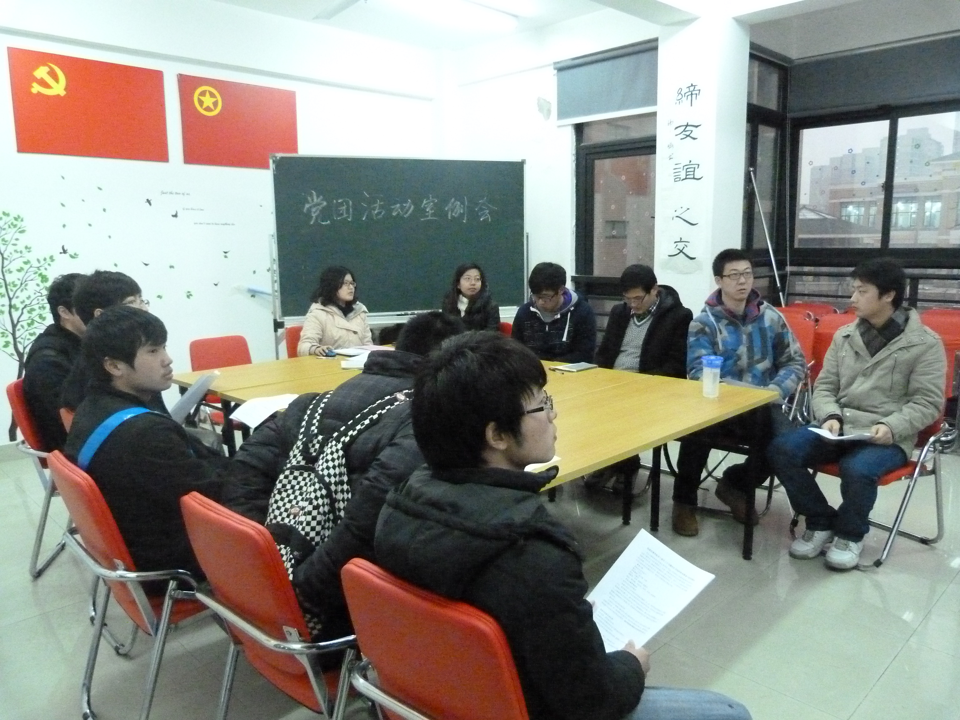 2012年3月1日下午,1-2号楼党团活动室指导老师陈方敏、刘昀及部分1-2号楼学生骨干于党团活动室召开了新学期第一次的党团活动室例会。