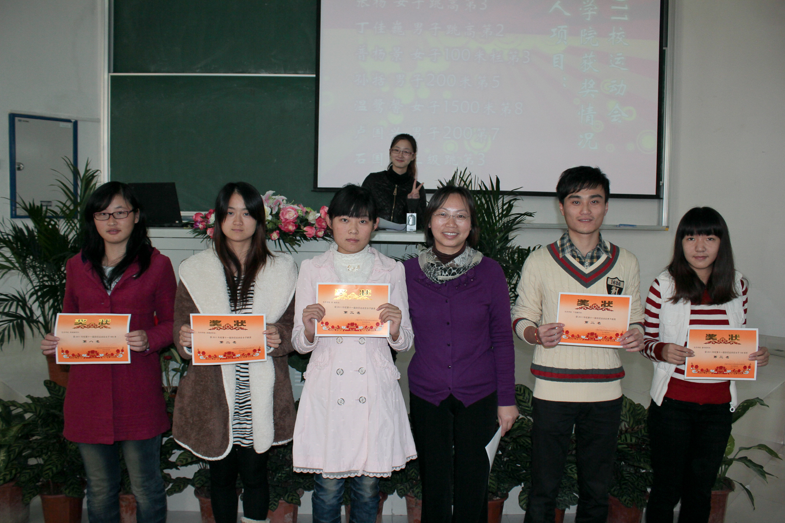 伴随着主持人精彩的开场词,拉开了本场颁奖大会的序幕。在运动会中生态学院的骄子们取得了良好的成绩,首先对在2011年上海应用技术学院运动会获得奖项的个人和集体项目获奖者进行表彰和颁奖,同学们都兴高采烈地从老师手上接过奖状。表彰队伍最强大莫过于荣获一等奖的广播体操比赛团队,引来场上阵阵掌声。“红色记忆与展望”建筑小品与“红色记忆与展望”手绘作品的颁发也引起了同学们的广泛关注。