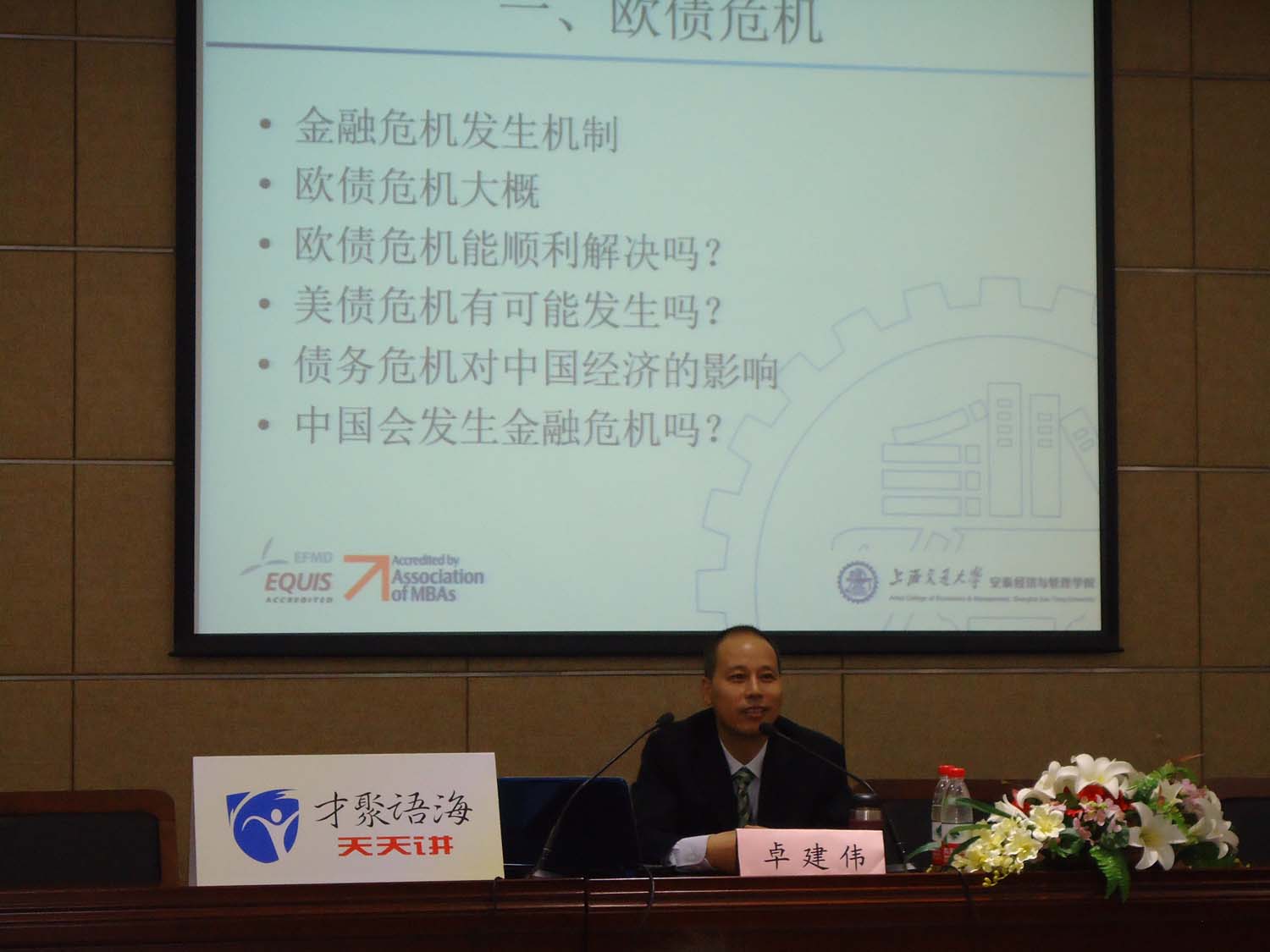 11月22日晚上,由学工部、校团委主办,理学院承办的“才聚语海”天天讲第120讲,在图书馆B101正式开讲。来自上海交通大学安泰经济管理学院、最受学生欢迎的卓建伟副教授,就当前社会经济热点问题为大家倾心指导。