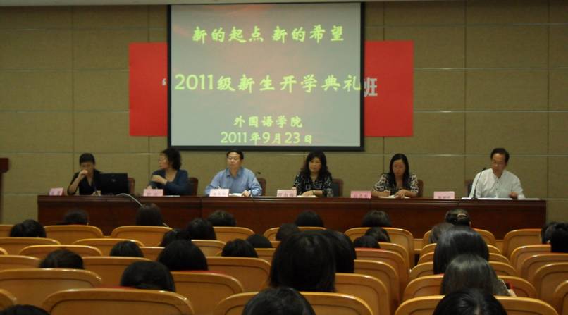 9月23日,外国语学院2011级新生开学典礼在奉贤校区图书馆B101隆重举行,96名本科新生以及49名专升本新生参加。外国语学院院长陈家旭、外国语学院党总支书记张淑梅、副书记副院长赵慧、副院长孙志青、英语教研室主任钟玲教授、德语教研室主任陈明浩教授以及所有新生班导师出席典礼。