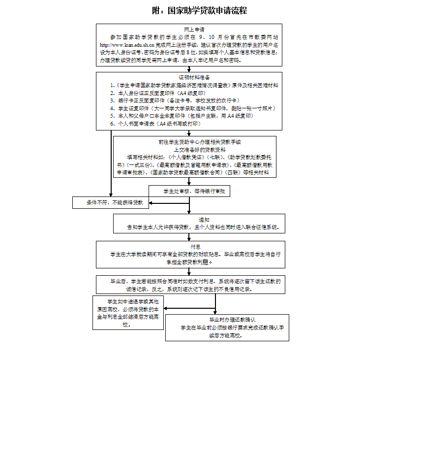 参加国家助学贷款的学生必须在9、10月份首先在市教委网站http://www.loan.edu.sh.cn完成网上注册手续,建议首次办理贷款的学生的用户名设为本人身份证号,密码为身份证号后8位,如实填写个人基本信息和贷款信息;办理贷款续贷的同学由本人牢记用户名和密码。