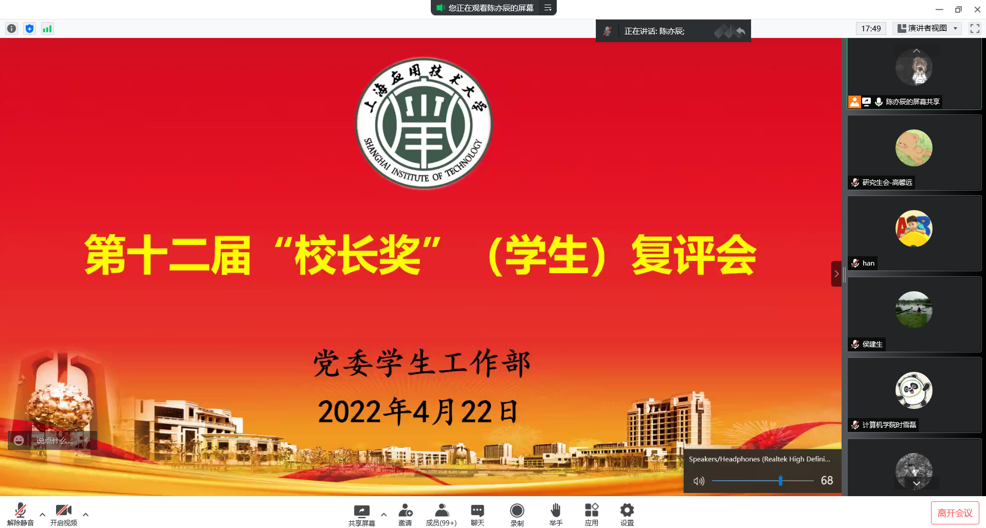 4月22日,学校第十二届“校长奖”(学生)复评会通过线上腾讯会议方式在云端举行。副校长张锁怀出席复评会,“校长奖”(学生)评审委员会委员、各学院党组织书记及教师学生代表近200人参加了本次活动。
