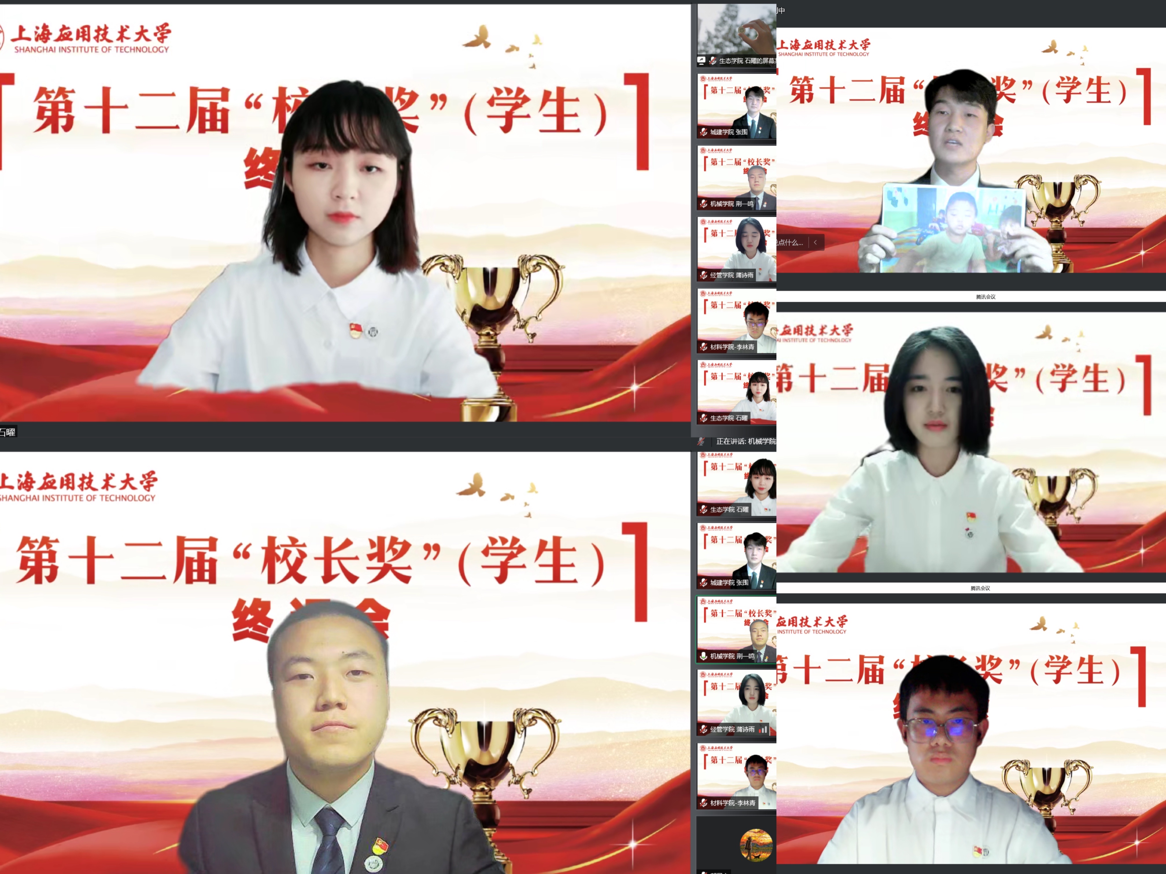 终评会上,五位“校长奖”候选人,来自机械工程学院荆一鸣、经济与管理学院蒲诗雨、城市建设与安全工程学院张围、生态技术与工程学院石曜、材料科学与工程学院李林青通过视频展示、个人演讲、现场答辩等环节角逐本届“校长奖”,展示了上应学子坚定理想、勇于创新、脚踏实地、自强不息的时代风貌。