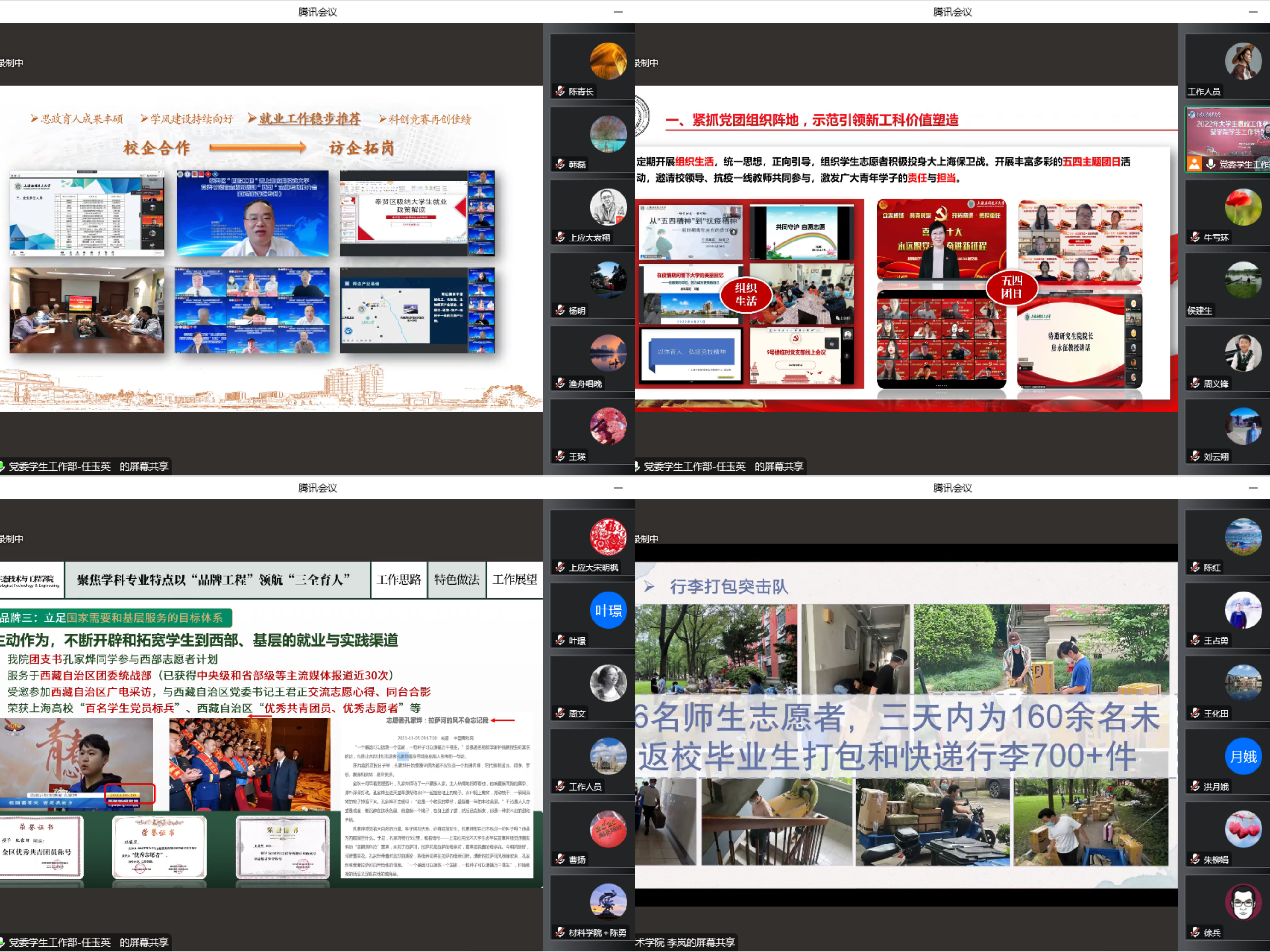 会上,各学院分管学生工作副书记,以及马克思主义学院、体育教育部相关同志立足立德树人根本任务,聚焦学院学生工作特色,围绕思政教育精品项目建设,依次作了汇报。各学院以学习宣传贯彻党的二十大精神为契机深入开展学习教育专题活动,学生工作坚持党建引领,深化思想强基夯实理想信念,重视知行合一提升实践能力,以创新守正的育人理念、校企协同的培养模式、依托平台的创新举措、以赛促学的建设抓手,探索疫情防控下学院学生思政工作的新举措。汇报凝练了多项思政教育品牌建设成果,如“创教融合培养模式”、“科创思政协同育人”、“OBE理念引领的思政模式”、“百村百企”工程、“本科生导师制”等等,体现了各学院重点突出、精耕细作、融合联动、协同育人、扎实推进大学生思政教育的显著成效。