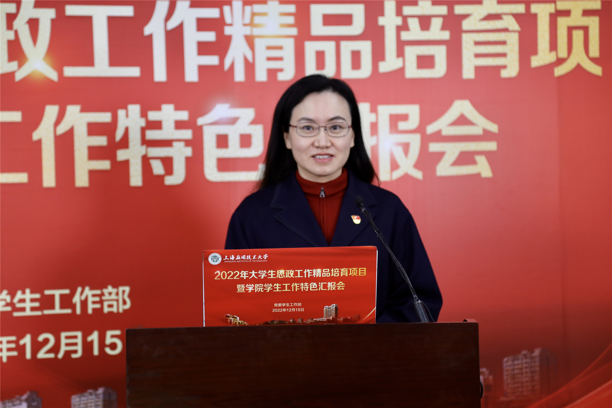 12月15日,学校举行2022年大学生思政工作精品培育项目暨学院学生工作特色汇报会,校党委副书记、副校长王瑛出席并讲话。校学生工作指导委员会委员、各学院党组织书记担任出席会议并担任评委。党委学工部部长袁翔主持汇报会。