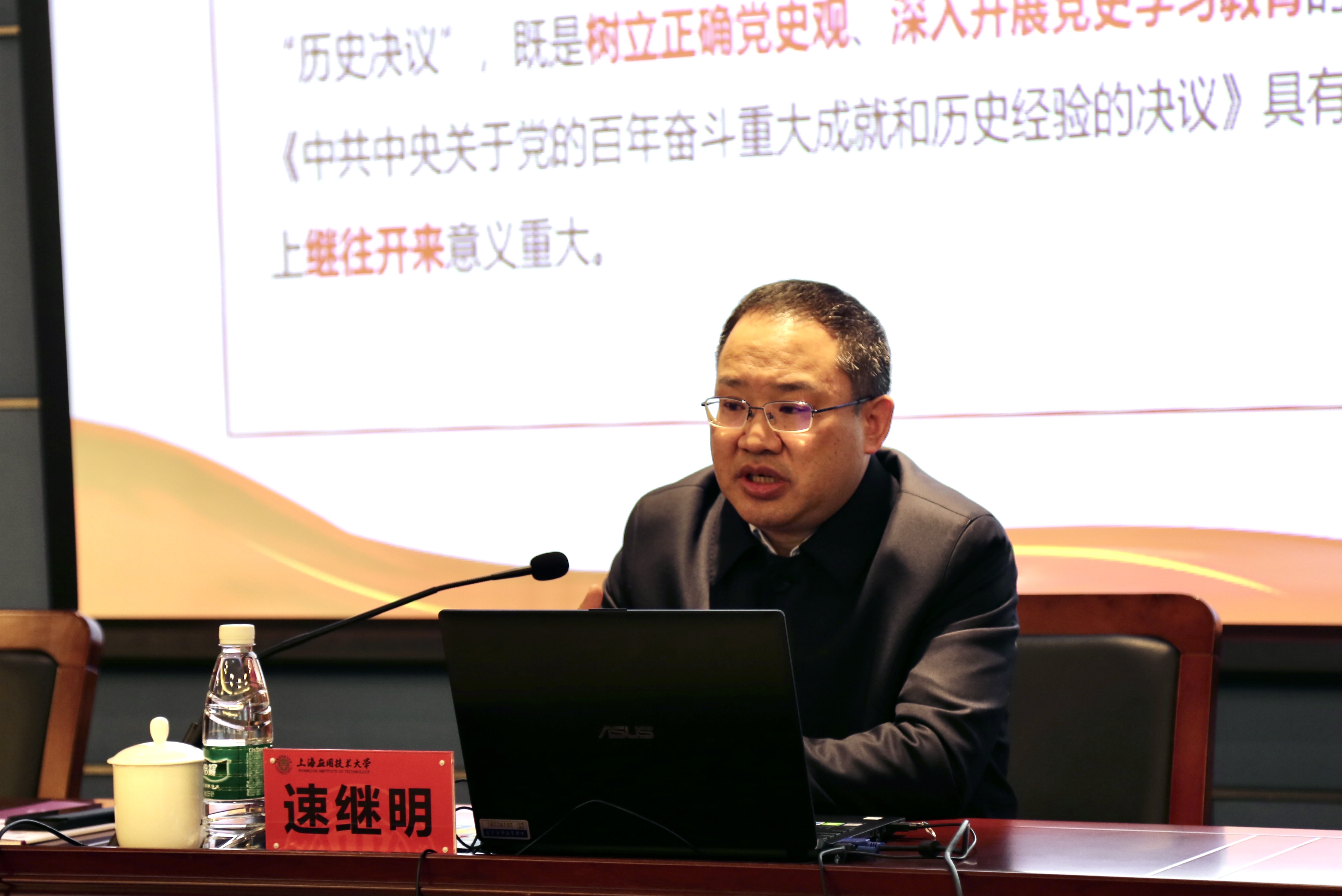 专题报告中,速继明教授以《在新的历史起点学习领会党的十九届六中全会精神》为题,回顾了我党关于历史问题的两个决议制定的背景、主要内容与重大意义,在介绍《中共中央关于党的百年奋斗重大成就和历史经验的决议》基本框架和主要内容的基础上,深入阐述了在新的历史起点《决议》的重大意义和深远影响。