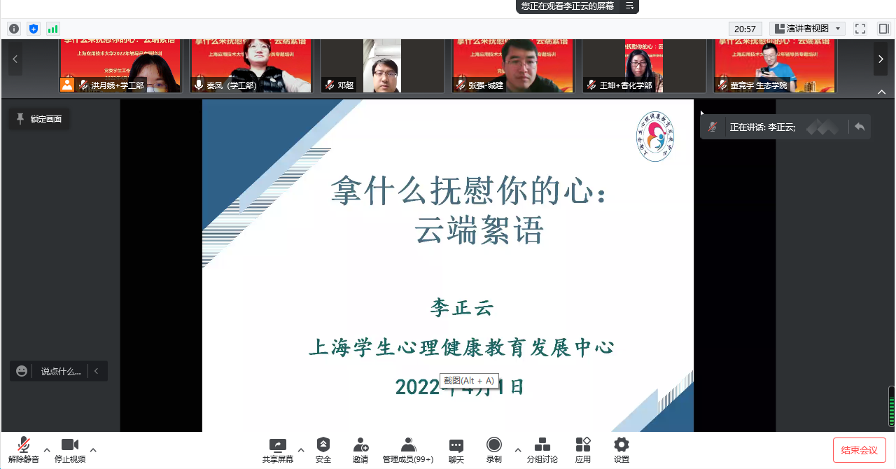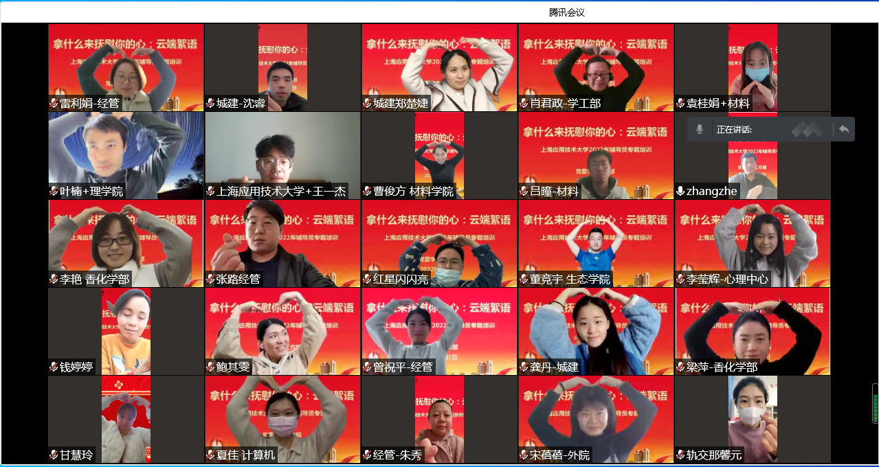 培训中,李正云教授既有“划江而封,这个春天有点冷”的感性分享、又有“校园封控,师生心理有点乱”的现实剖析、也为辅导员们研究分析影响师生心理的各类因素,并提供安心守护的应对方案以及相关资源渠道。我校辅导员在培训中分享了自己一个月来在校工作生活的感受。整场培训如沐春风,潜入人心。培训最后,所有参会辅导员在云端比心,致我们因疫情错过的见面与拥抱,共同期待春天的会面。