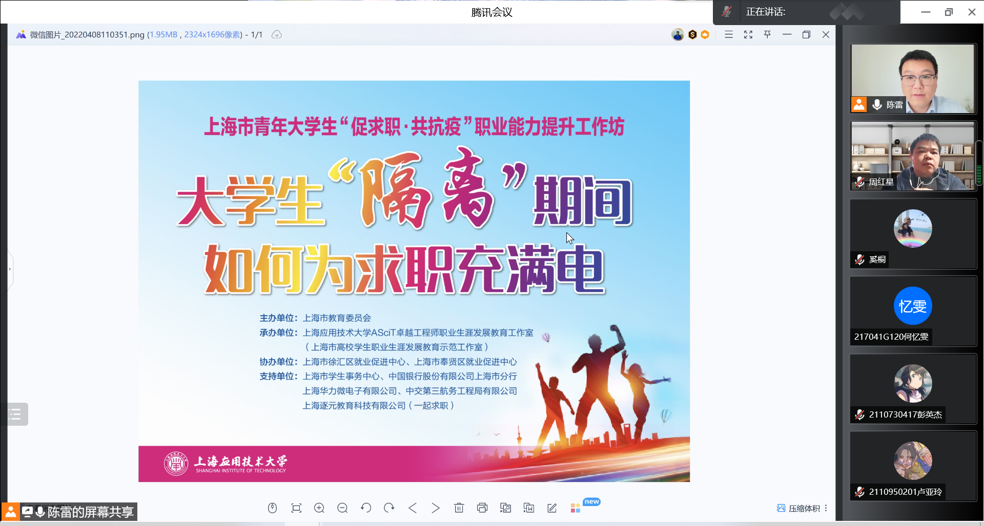 为切实在疫情防控背景下继续做好做实“六稳六保”工作,提升“隔离”期间未就业大学生的求职就业能力,4月8日下午,由上海市教委主办,上海市职业生涯发展教育示范工作室(上海应用技术大学ASciT卓越工程师职业生涯发展工作室)承办,上海市学生事务中心、徐汇区就业促进中心、奉贤区就业促进中心联合协办的上海市青年大学生“促求职·共抗疫”职业能力提升工作坊顺利在线上举行,来自东华大学、上海海洋大学等十余所高校共计500多名师生“云端”相聚,上海市学生事务中心副主任周红星出席并致辞。