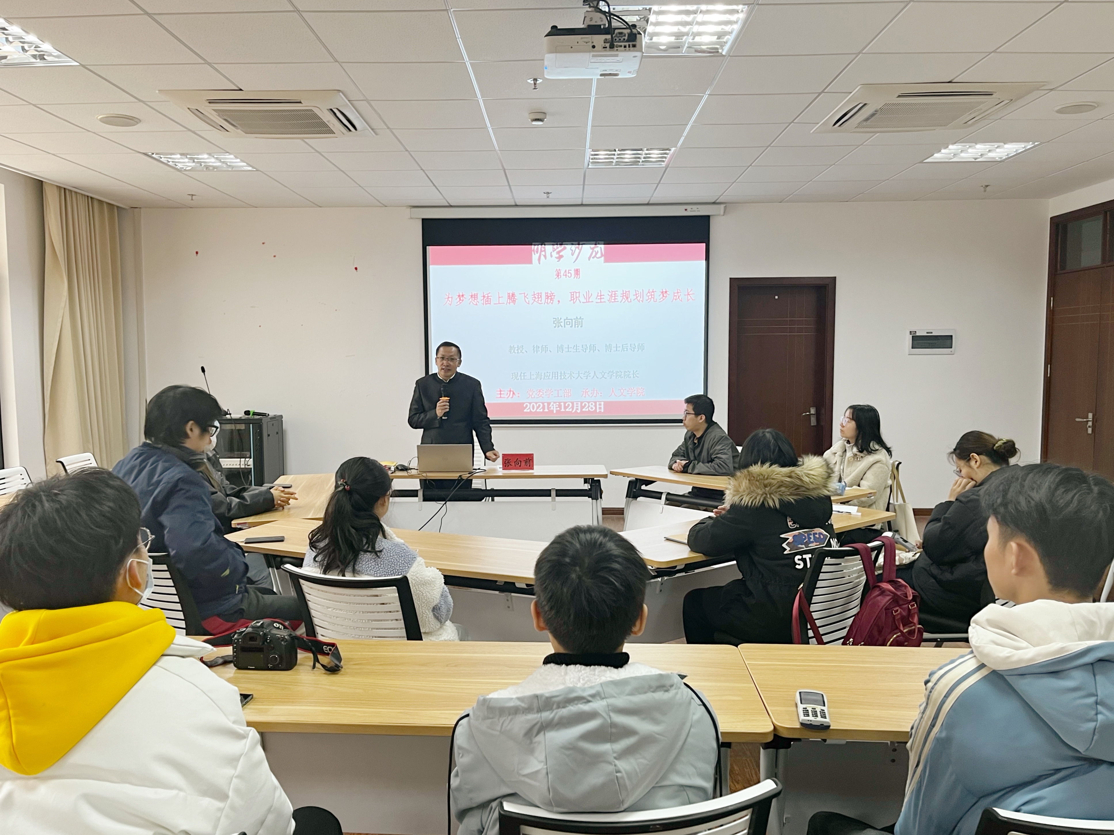 2021年12月28日,由党委学工部主办、人文学院承办的第45期明学沙龙“为梦想插上腾飞的翅膀,职业生涯规划筑梦成长”于第六学科楼A319举行。上海应用技术大学人文学院院长、博士生导师张向前教授应邀主讲。