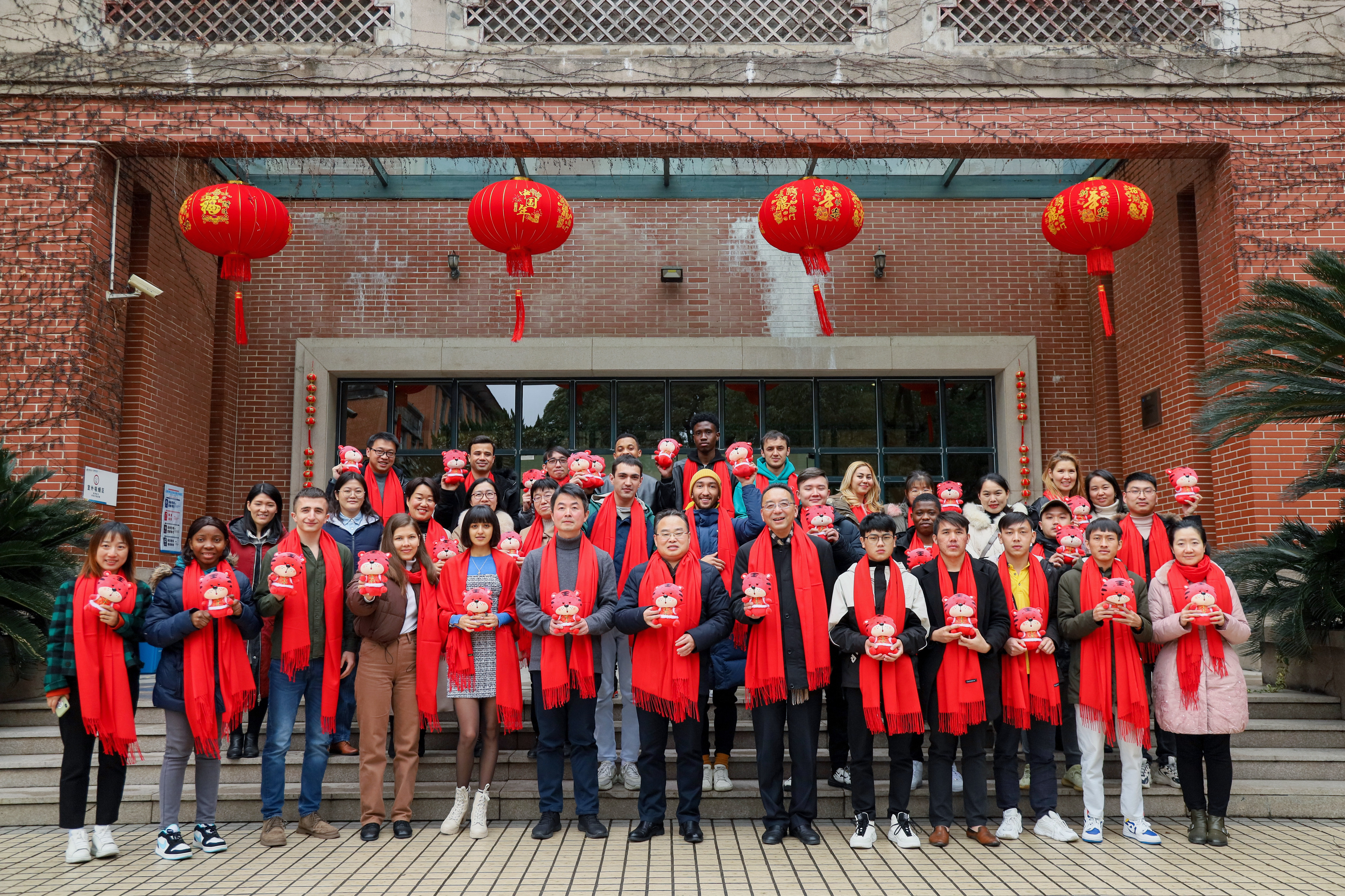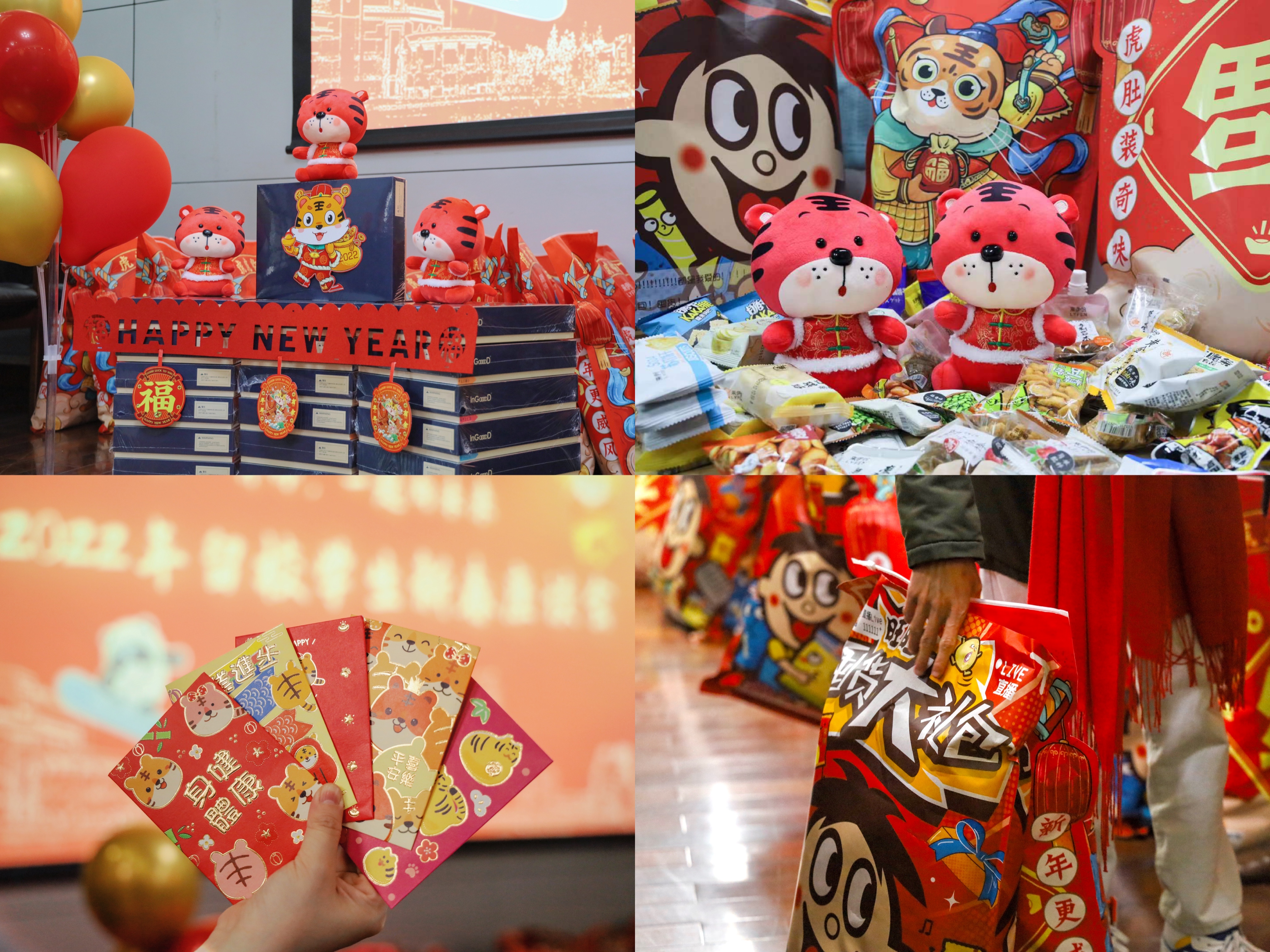活动最后,郭庆松为留校学生送上压岁钱和新春礼包,亲切了解他们的学习生活情况并与留校学生合影留念。