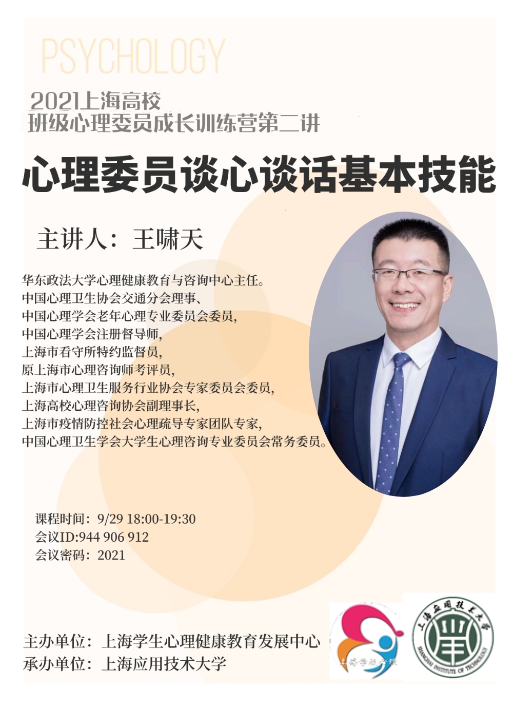 为进一步提升班级心理委员的朋辈辅导技能,9月29日,上海高校班级心理委员成长训练营第二场培训邀请华东政法大学大学心理健康教育与咨询中心主任王啸天主讲《心理委员谈心谈话技能技能》。
