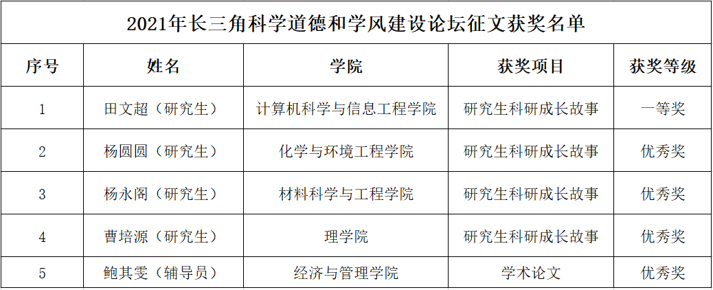 近日,2021年长三角科学道德和学风建设论坛征文拟获奖名单公布,我校师生投稿文章荣获一等奖1项、优秀奖4项,成绩可喜!