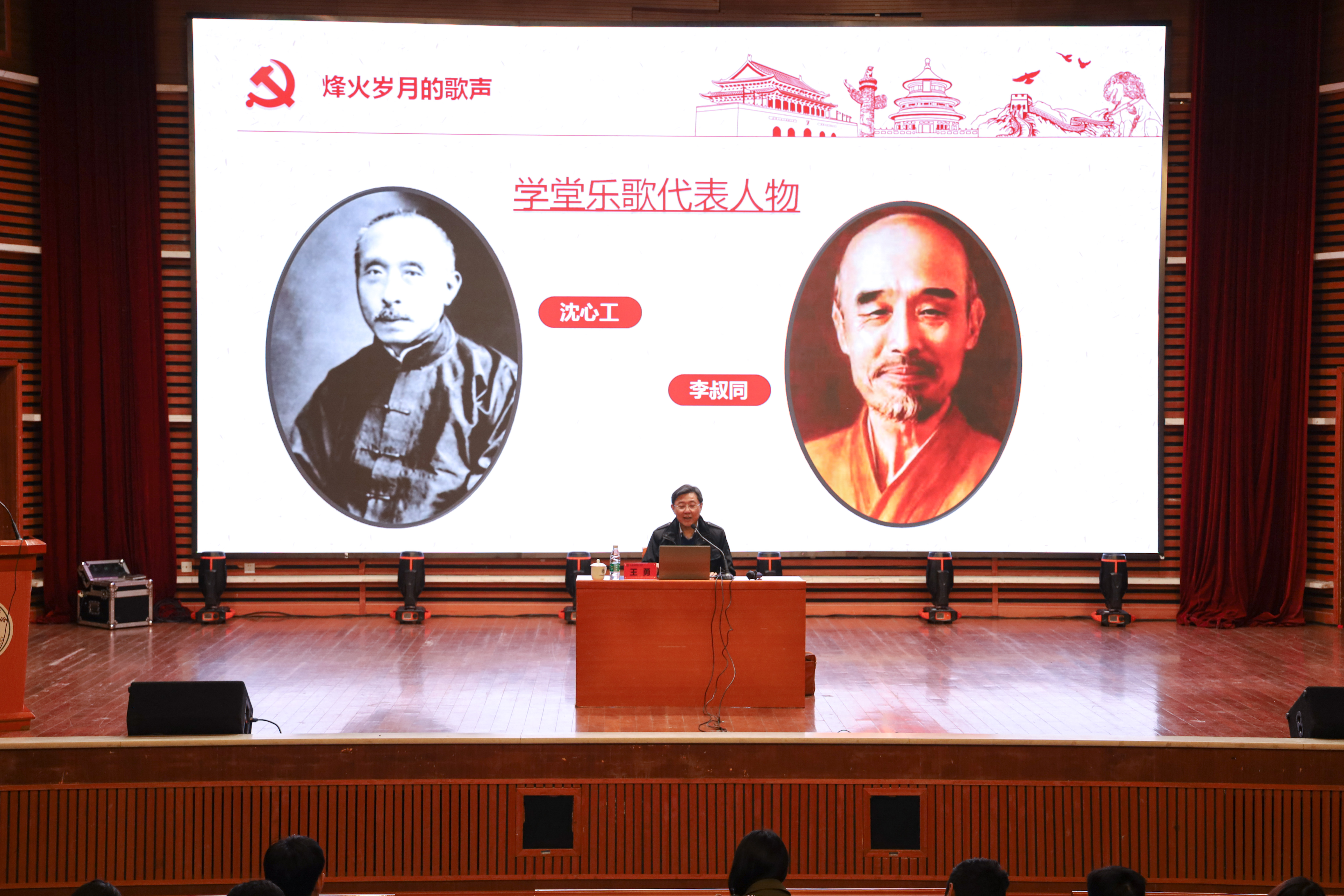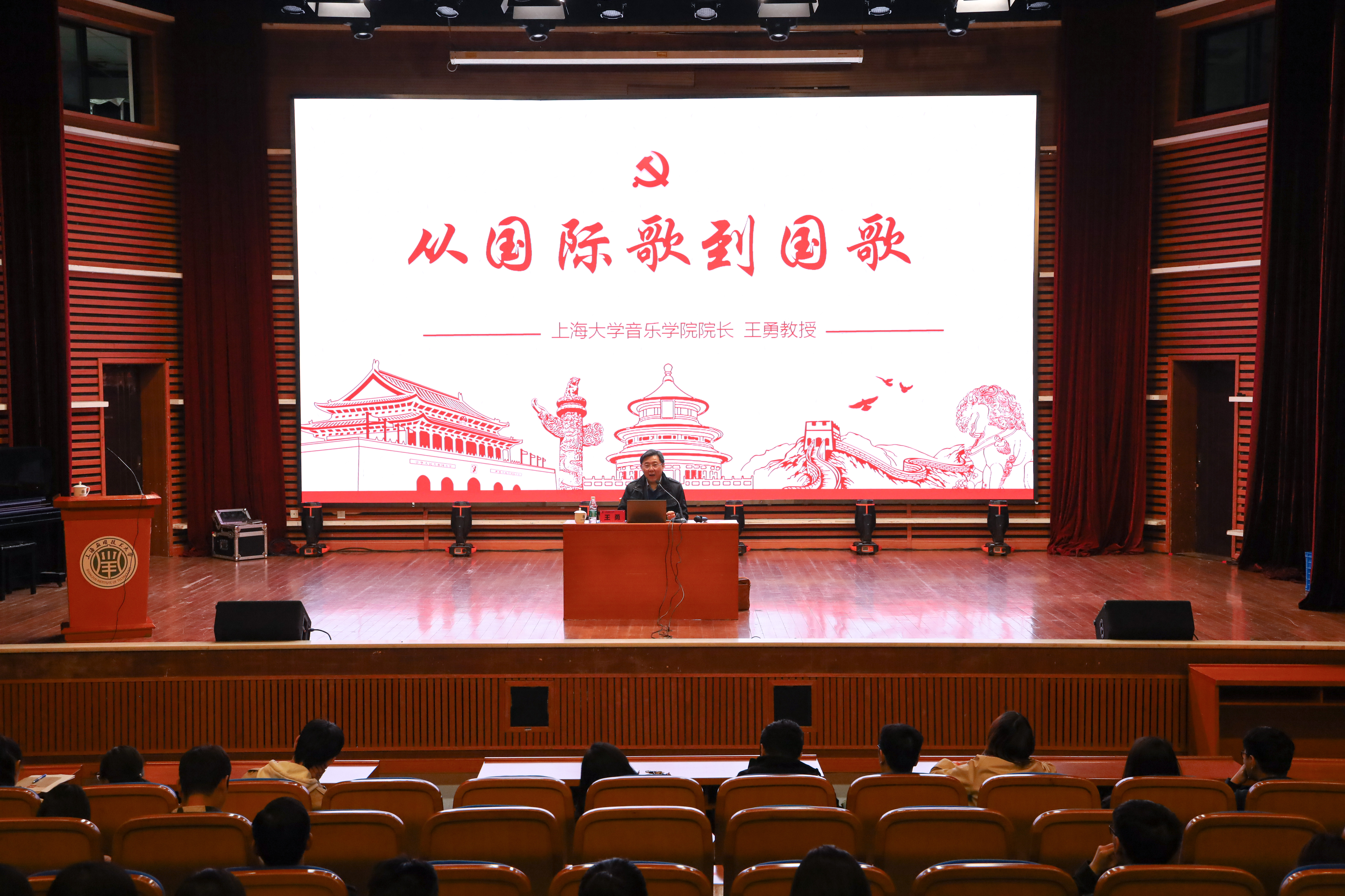 音乐党课特邀嘉宾上海大学音乐学院院长王勇教授前来授课。他以一组脍炙人口的革命军歌开场,从学堂乐歌到北伐军歌,从《国际歌》的传入到《义勇军进行曲》的创作,从左翼音乐家联盟到延安鲁迅艺术学校,以自身的学术研究方向为出发点,结合历史重大事件,以史串歌,以歌叙史,细数革命历史歌曲从启蒙到繁荣的发展脉络。一首首耳熟能详的革命歌曲,把大家带回那歌声中的峥嵘岁月。