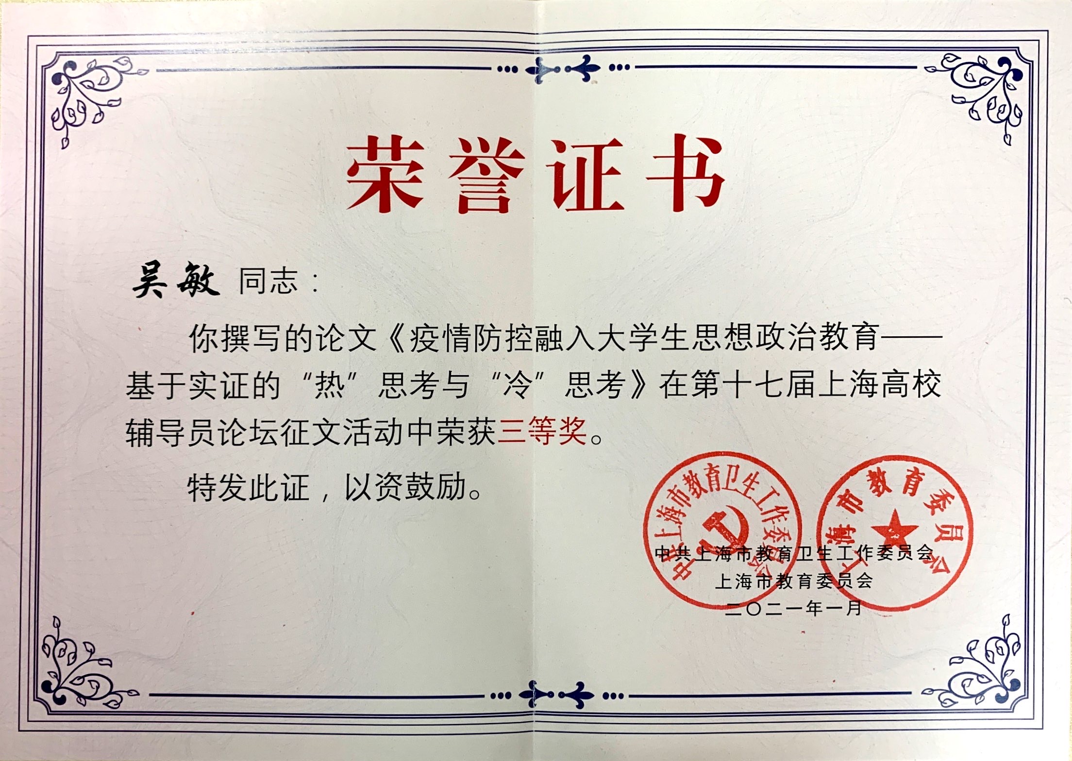 会上颁发了第十七届上海高校辅导员论坛征文活动、第九届上海高校辅导员素质能力大赛以及2020上海高校辅导员年度人物及提名奖的荣誉奖项。我校艺术学院特教辅导员吴斐喜获2020上海高校辅导员年度人物,我校辅导员团队荣获上海高校辅导员团队素质拓展三等奖,校党委学工部副部长吴敏荣获第十三届高校辅导员论坛征文三等奖。