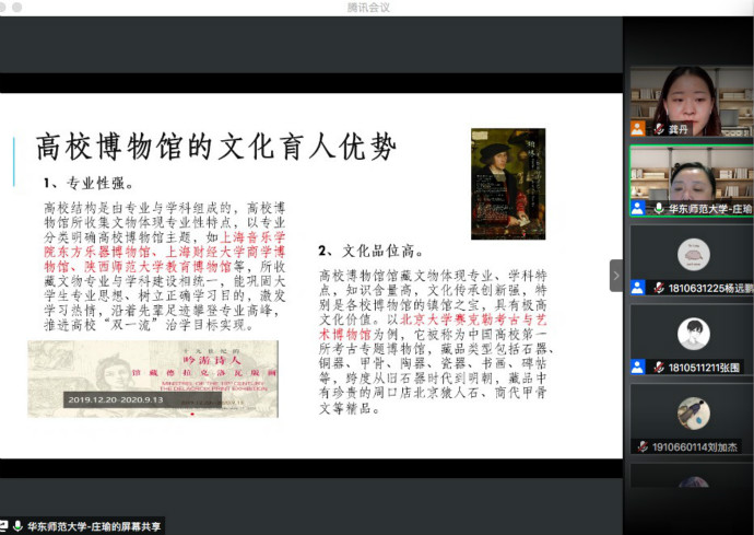 高校博物馆不同于一般的综合型博物馆,是依托高校不同学科拥有更专业的主题博物馆,其丰富的馆藏是构筑文化自信的重要基础。庄老师着重介绍了京师同文博物馆、南通大学的现代教育技术博物馆和陕西师范大学教育博物馆。庄老师借此提出了“文化自信”,指出文化兴国运兴,文化强民族强,以高效博物馆为依托,进行文化育人。庄老师总结了高校博物馆的文化育人优势,专业性强、文化品位高、爱国情怀深;以及高校博物馆的美育优势,传承文化价值、涵养文明育人价值、树立正确历史观、树立理想信念的榜样。庄老师条分理析地讲述了高校博物馆具体的育人路径——建设主题教育活动场所;打造线上线下合力育人阵地;开拓形势与政策课课外基地等。