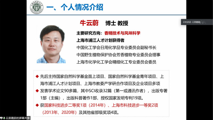 牛云蔚教授重点介绍了自己的学科专业和教学科研方面。香料香精作为近些年来上海市的重点发展学科,发展迅速,牛教授参与了其中三个国家级项目和四个省部级项目,为完成上海市建设“健康美丽全产业链”做出了卓越贡献。他指出,80%的香料香精技术人才和50%的香料香精技术成果皆出自我校,他还介绍了我校香精香料研究团队的主要研究成果,如RIO鸡尾酒、指甲油、芳香照片、芳香墙纸、芳香铅笔等。同学们对牛云蔚教授带来的个人成长经验和学术前沿分享,兴趣盎然,意犹未尽,纷纷同牛教授进行在线互动。来自香料学院、生态学院的同学们,就芳香疗法在情绪控制方面的应用、芳香植物的提取和研究、香料行业发展、交叉学科发展等问题进一步提问和探讨。