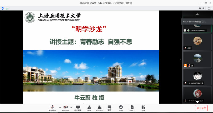 5月20日,以“青春励志,自强不息”为主题的第21期“明学沙龙”在线上和同学们见面了。我校原2005届校友、现香料学院研究生导师、上海浦江人才计划获得者牛云蔚教授担任主讲嘉宾。本次讲座由香料学院承办,100余名上应学子在线聆听。牛教授结合自己的学习、工作经历,向同学们讲述了自己在成为一个香料界学术大咖道路上的探索和成长,他鼓励同学们志存高远,脚踏实落,努力成长为高水平应用技术型人才。讲座从个人情况介绍、教育工作经历、学科专业介绍和教学科研成果四个方面展开。