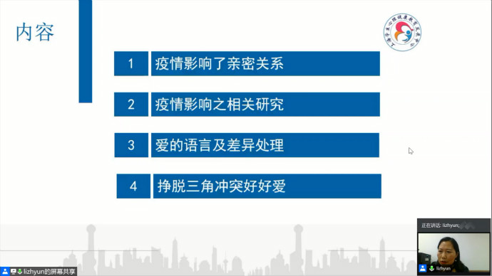 李正云由当前社会热点案例引出因疫情影响的亲密关系矛盾和冲突激化问题,透过最新疫情下亲密关系的研究展示了亲子亲密关系和婚恋亲密关系在疫情不同条件下的变化特征和趋势。她用生动的故事为大家详细讲解了在后疫情时代如何通过爱的五种语言让我们彼此珍惜、亲情不断、爱情亲密。她指出,在表达爱意时应该考虑自己惯用的“示爱通道”和对方的“受爱通道”的匹配度,以更好地提升“亲密关系”的紧密度。李正云列举了几种处理亲密关系差异和冲突的常见方法,分析处理方式的利弊,提出“分离-独立-亲密-融合”四部曲,帮助大家挣脱“三角冲突“好好爱。