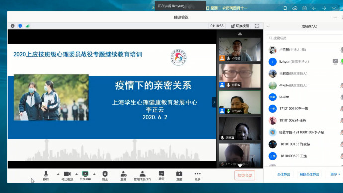 6月2日,党委学工部心理健康教育中心开展2020年班级心理委员战疫专题继续教育培训,首场培训邀请上海学校心理健康教育发展中心主任李正云教授开讲《疫情下的亲密关系》。复旦大学、同济大学和上海大学等27所上海高校教师、我校各学院心理辅导员和全体2017级、2018级班级心理委员共200余人通过在线方式参与,培训由党委学工部副部长牛亏环主持。