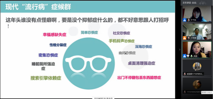 金金从疫情发生后的生活改变引出“信息大爆炸”问题,重点介绍了因“信息大爆炸”引发的各类“症状”及其产生的生物学、行为学、情绪、社会功能的表现,提出我们应正视问题,积极的面对问题。她用真实、生动的案例向大家讲解了抑郁症和焦虑症的识别、诊断,并通过视频的方式介绍了应对的常用方法——正念。