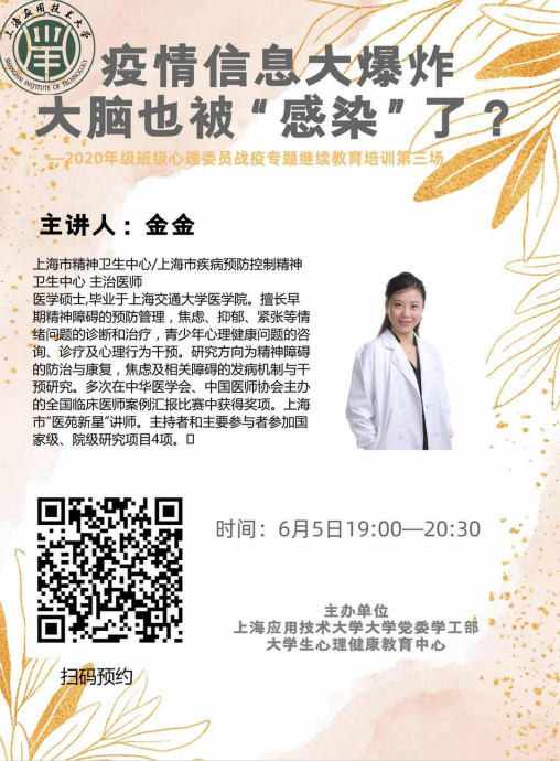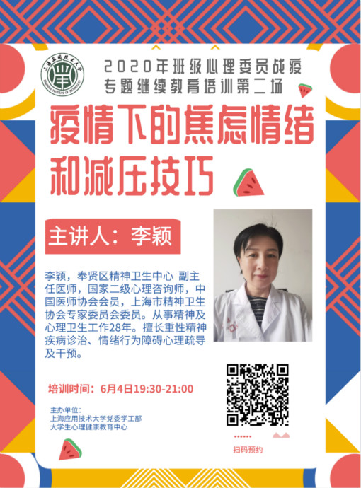6月4日和5日,党委学工部大学生心理健康教育中心举行2020年班级心理委员战疫专题继续教育两场培训,邀请奉贤区精神卫生中心门诊科主任李颖和上海市精神卫生中心金金医师分别主讲《疫情下的焦虑情绪与减压技巧》和《疫情信息大爆炸-大脑也被“感染”了?》,各学院心理辅导员、各年级班级心理委员共计300余人在线参与培训。
