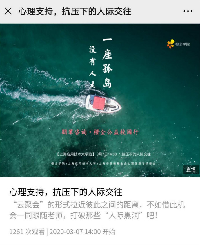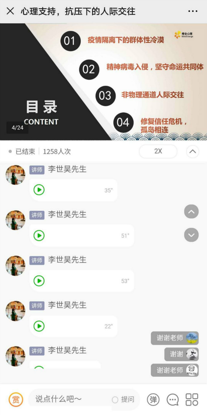 直播课程主讲老师李世昊用生动有趣的方式,结合互联网热点事件讲解了疫情隔离下可能造成的群体性冷漠,列举了疫情期间部分人群产生的负面情绪和心理不适。他强调面对疫情产生的恐惧、焦虑和孤独是应激下的正常反应,我们需要客观全面认识自己的情绪反应,不必过分恐慌。他介绍了几种非物理通道人际交往新方式,指导大家通过积极心态和行为准备,和家人、朋友、自己以及陌生人更好地相处,利用互联网发现更好、更大的世界,将每一座孤岛相连,缓解恐惧与孤独感,并在此基础上发现更好的自己。