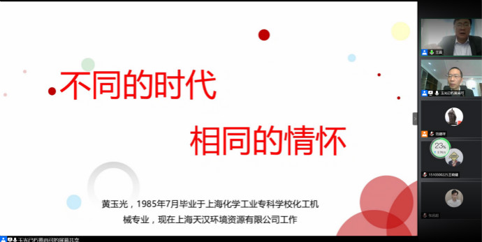 5月11日,“明学沙龙”第20期线上进行,我校1985届校友、上海天汉环境资源有限公司总经理黄玉光先生百忙之中向我校学生做了“不同的时代·相同的情怀”主题报告。黄玉光先生发自肺腑,真情实意与学生们进行交流讨论。他回忆自身经历,感慨现今生活之美好,祖国之强大。本次讲座黄光玉先生分校园情怀,家国情怀,爱的情怀三部分展开。