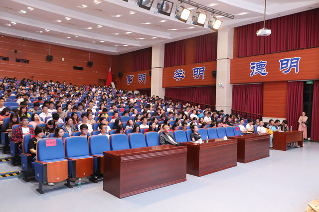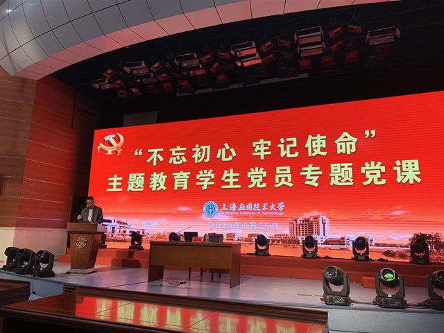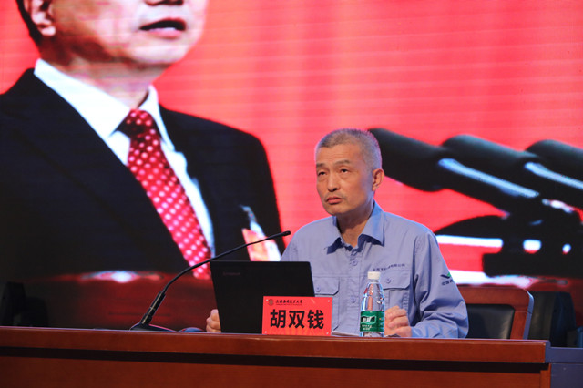 为庆祝新中国成立70周年,切实推动我校师生在“不忘初心、牢记使命”主题教育中往深里走、往心里走、往实里走,9月25日晚,学校在图书馆B106报告厅开展“不忘初心、牢记使命”主题教育学生党员专题党课。本次党课邀请荣获“大国工匠”、全国劳动模范、全国道德模范等荣誉称号的中国商飞上海飞机制造有限公司高级技师胡双钱同志作为主讲嘉宾,党委学生工作部及校团委全体党员、奉贤校区各学院学生党支部书记、学生党员代表共500多人参加。党委学工部部长袁翔主持专题党课。