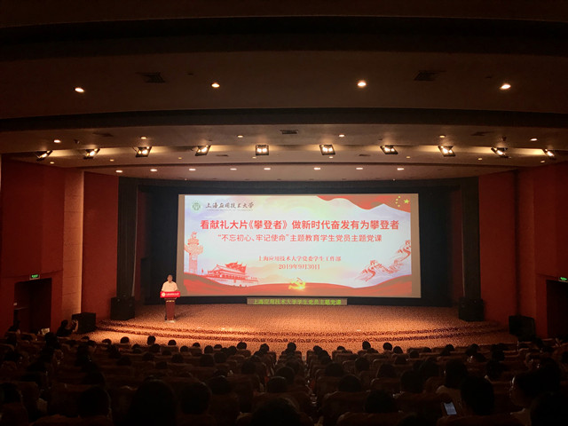 9月30日上午,我校270名学生党员齐聚上海影城,共同观看新中国70周年献礼大片《攀登者》,这是一堂不一样的“不忘初心、牢记使命”主题教育党课。不一样的地方在于这堂党课除了市委第十二巡回指导组组长张超美及指导组组员、上海应用技术大学党委书记刘宇陆和听课的学生党员之外,还有一位全国优秀教师、上海应用技术大学教授周小理,共同带来了一堂令人热血沸腾、心潮澎湃的主题党课。此次主题党课由党委学生工作部部长袁翔主持。