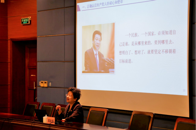 紧接着,宋敏娟从三个方面深入浅出地讲解了“不忘初心、牢记使命”的历史逻辑、现实意义以及实践路径。首先,正确认识共产党人的初心和使命。她从“初心”历史讲起,分析了什么是初心以及为什么要守初心这个根本性问题,阐释了“不忘初心、牢记使命”的由来与立意,并重点讲解了坚持“不忘初心、牢记使命”的必要性:这是加强思想政治建设的迫切需要;是有效履行学工干部职责使命、搞好本职工作的迫切需要;是加强作风建设,走进学生心灵的重要前提。第二,严格对标共产党人的初心与使命。敢于直面问题、勇于修正错误是我们党的显著特点和优势,要对标共产党人初心找差距,对照新时代中国特色社会主义思想和党中央决策部署、对照党章党规、对照人民群众新期待、对照先进典型、身边榜样,坚持高标准、严要求,找一找存在哪些差距,有的放矢进行整改。第三,守初心、担使命,为党育人、为国育才。从习近平总书记关于教育的重要论述讲起,强调了教育的首要问题与根本问题,并以香港近期动荡的局势为例,生动地展示了对青年群体开展思想政治教育的重要性与必要性。同时引用习近平总书记关于青年培育的形象化表示:“培土、浇水、施肥、打药、整枝”等等给与大家开展思政工作的方法论指导。