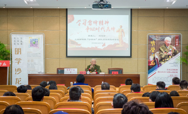 3月21日,“明学沙龙”第八期“学习雷锋精神 践行社会主义核心价值观”专题活动在图书馆B101报告厅举行。本期沙龙邀请了新四军老战士、上海新四军“沙家浜部队”历史研究会会长刘石安老战士担任主讲人。人文学院党总支书记周文、副书记、副院长朱敏、学工部、辅导员代表以及学雷锋活动志愿者200多名余人参加了此次活动。