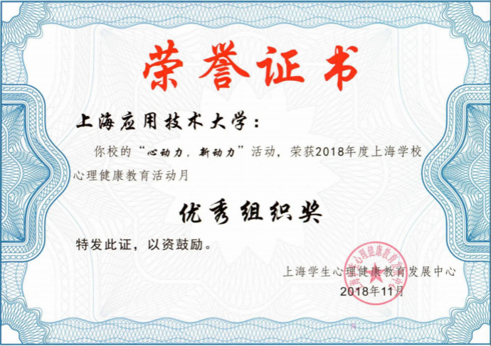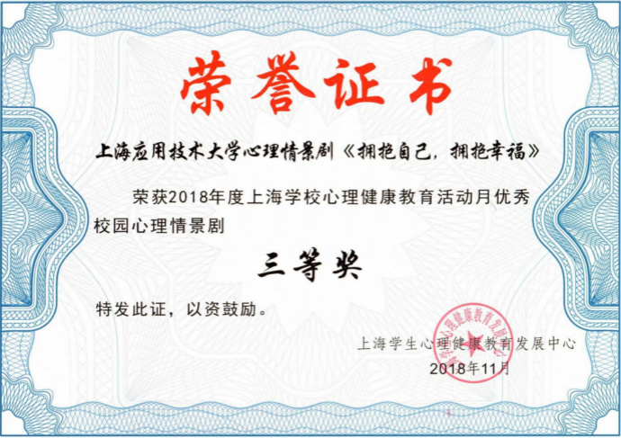 近日,我校收到上海学生心理健康教育发展中心颁发的2018年度心理健康活动月优秀组织奖证书。据悉,全市仅13所高校荣获此项荣誉,而我校也位列其中。此外,我校校园心理情景剧《拥抱自己,拥抱幸福》也荣获“2018年度上海学校心理健康教育活动月校园心理情景剧大赛三等奖”。