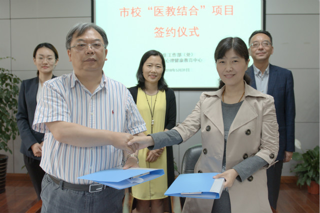 2018年5月31日,我校与上海市精神卫生中心在徐汇校区图文楼117会议室举行市校“医教结合”项目签约仪式,开启了我校心理育人体系专家专业指导的新模式。上海学生心理健康教育发展中心主任李正云,上海市精神卫生中心儿童青少年精神科主任杜亚松,校党委学工部部长袁翔、副部长牛亏环,华东理工大学心理健康教育中心刘蓉等出席,我校各学院心理辅导员及心理中心全体人员参加本次签约仪式。