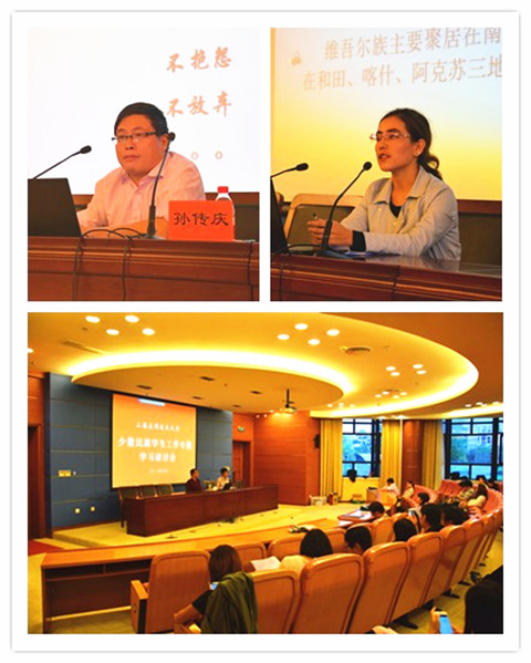 内派教师孙传庆就新疆地区近现代人文历史演进、社会经济发展情况做了清晰、详尽地介绍,梳理和解读了中央关于民族工作的政策及法律法规,并在此基础上对高校少数民族学生的教育、管理和服务工作提出了建议。内派教师阿提开姆·黑力力作了基于新疆籍少数民族学生的宗教与风俗习惯、日常生活状态与心态分析的管理服务技巧和建议的专题办稿。两场专题报告之后,参会成员分成两组,就日常少数民族学生工作中存在的问题、难点、典型案例及本次研讨会的学习心得进行交流,并进行了总结发言。