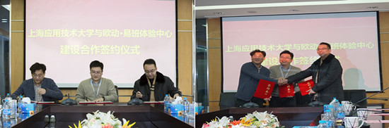 2016年新年伊始,上海应用技术学院“欧动.易班”体验中心建设合作签约仪式在上海易班发展中心总部举行。上海市教卫工作党委宣传处处长助理、上海教育系统网络文化发展研究中心副主任王力力、上海易班发展中心总裁朱明伦、副总裁冯俊峰,上海欧动传媒科技有限公司董事长李浩铭、总经理洪懿南,我校党委副书记、副校长张艳萍等嘉宾出席。冯俊峰主持会议。