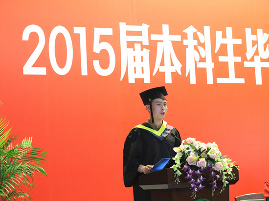 在全场师生高声齐唱的国歌声中,毕业典礼正式拉开帷幕。上海市优秀毕业生获得者,来自人文学院的曹胜伟同学首先代表2015届毕业生发言,他追忆了大学四年与同窗们的相知相伴,表达了对母校的无限留恋之情,并感谢母校的培养、老师的悉心教导、辅导员的成长陪伴、父母的养育之恩。他表示一定秉承“明德、明学、明事”的校训,认真做人,勤恳做事,在自己的工作岗位上默默耕耘、发光发热,为母校争光添彩。