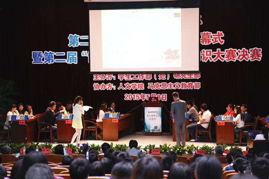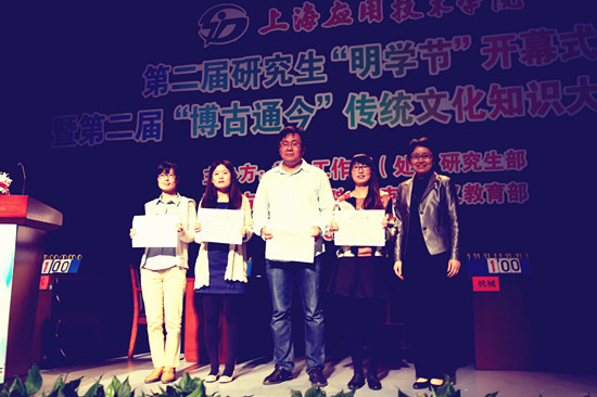 开幕式结束后,经过短暂休息,进行了“博古通今”中国传统文化知识大赛决赛,六支参赛队在完成个人必答题(成语听写)、小组必答题(诗词接龙)、抢答题和风险题四轮激战后,联合(计算机、经管、生态、城建)学院代表队获得第一名,电气学院和香料学院分获二、三名。