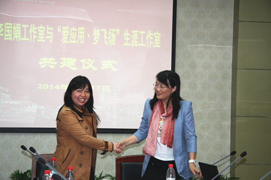 10月17日下午,我校李国娟工作室与“爱应用·梦飞扬”生涯工作室在图书馆B103室举行了隆重的签约共建仪式。副校长张艳萍出席活动并讲话。学生处主要负责人、人文思政联合党总支负责人、马克思主义教育部教师以及“爱应用·梦飞扬”生涯工作室成员等共六十余人参加了活动。