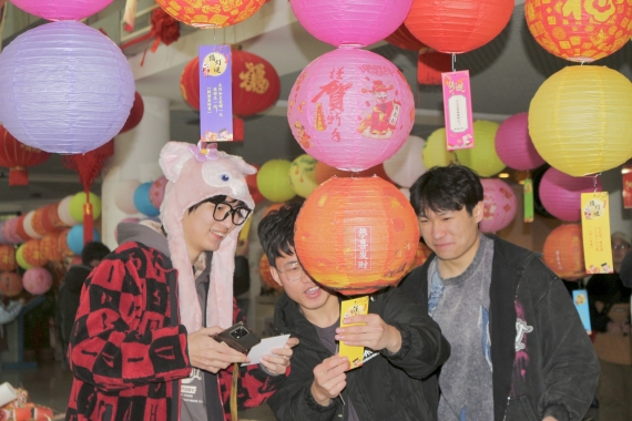 活动现场气氛热烈温馨,学校准备了热气腾腾的汤圆,老师们现场向参与活动的同学致以新春的问候与祝福。活动中心一楼挂满了灯笼、围满了猜灯谜的同学。制作花灯、拼画团扇、投壶游戏、剪纸艺术、拓福寻龙等传统元宵年俗活动吸引众多同学参与,提升了学生对中华传统文化的感知。
