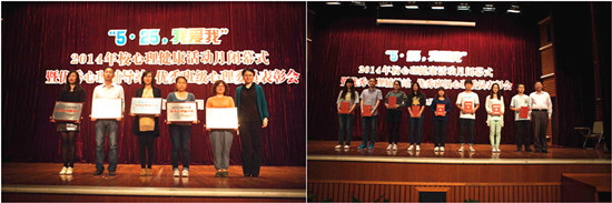 会上,心理健康教育中心副主任对2014年5·25心理健康活动月的特色和成效做了总结。本届心理健康活动月有三大特色:一、参与主体广,活动品质高。心理健康教育中心、各二级学院、大学生心理协会以及班级心理委员、在校大学生广泛参与,受益的学生近3000人,而且邀请到了校内外的心理专家、教授亲临指导,提高了活动的质量和效果;二、多方联动,形式多样。本次活动月充分动员并发挥多方力量,全校16个学院全员参与,精心策划、共组织了三十五项校级与院级心理活动。三、内容鲜活,突出实效。本次心理健康月系列活动将针对性与实效性、实践与知识相结合,不仅为心理健康知识的普及提供了良好的契机,而且为增强学生自我探知、应对挫折的能力提供了切实有效的方法与启示,同时还提升了学生之间的互助能力。